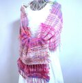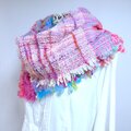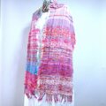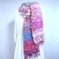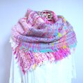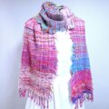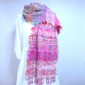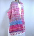 毛糸を何色も組み合わせて手織りした、さをり織りのウール・ロングストールです。花が咲き誇る野原をイメージして織りました。