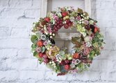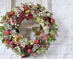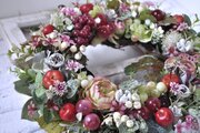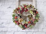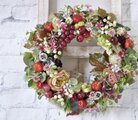 リース素材:アーティフィシャルフラワ-(造花):葡萄(赤紫)・小さな葡萄(赤紫・グリーン)・りんご・アイボリーの実・バラ・スイトピー・小花・カラーリーフ・アンバーバーム・グリーン、など。