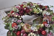 以前見かけた素敵な葡萄のリースが忘れられず、オーダーをお願いしました。実りの豊かさが手のひらに重さとして感じられるような豊穣のリースです。 瑞々しい葡萄、色々な実もの、最後にはなりえ様おすすめの小さなりんごをあしらっていただき、ため息が出るほど贅沢にできあがりました! いつも素敵な作品をありがとうございます。
