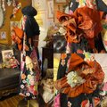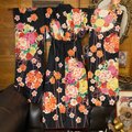 【 振袖 着物 ロングワンピース ドレス 2部式ローズ/バラ作り帯 リメイク 洗える 化繊 パールつけ襟 フリルシフォン帯揚げ 和洋折衷 ハンドメイド レトロ 古着 漆黒の地紋入り生地に、艶やかな花束 FKW-31】