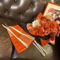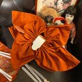 二部式帯は煉瓦色(テラコッタ)×細縞を基調に、背はローズ結びでドラマティックに。黒チュールと白花コサージュがきゅっと甘辛バランスを整え、前のパール装飾が品よくきらめきます。黒×温かいオレンジ系のコントラストが肌映りを明るく、写真・ステージ映えも抜群。