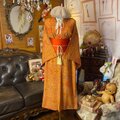 【着物リメイクワンピース セミロング|洗える化繊素材&帯サッシュベルト付き レトロ 古着 ハンドメイド 金茶~柿渋を基調に、花唐草や花菱、七宝、菱格子、青海波などの古典文様 KW-1083】