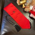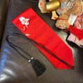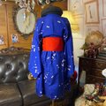 付属の帯ベルトは**緋色(あざやかな朱赤)の無地。片端に可憐なワンポイント刺繍(縁起物モチーフ)**を配し、黒の組紐タッセルでキリッと引き締め。青×赤のコントラストがスタイルを際立たせ、写真映え・お出かけ映えも抜群です。