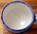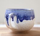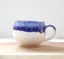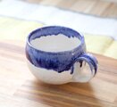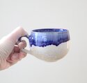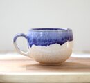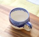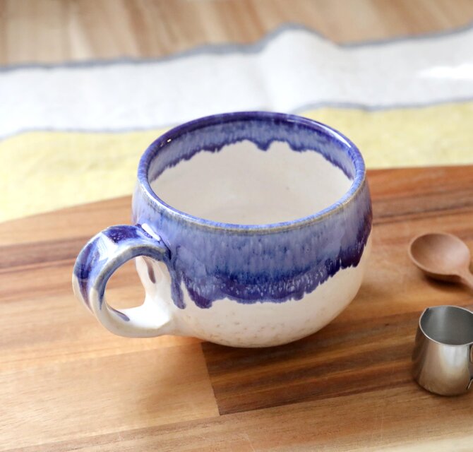 艶やかな白い釉薬を全体にかけ、さらに口元に深い瑠璃色の釉薬を施した、大きめのマグカップです。