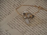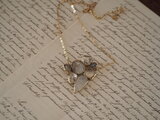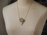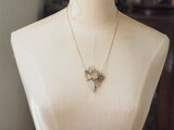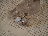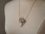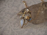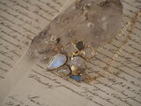 青い光が美しいレインボームーンストーンとクリスタルで、とびきり美しいネックレスを作りたくなりました。クリスタルはヒマラヤ水晶、ブラジル産の原石クリスタルなど、なるべくナチュラルな物を選びました。そうして石を選んでいる時ふと目に止まったのが小さなラブラドライトの原石たち。ぼんやりと薄青く光っています。その光り方が気になって、試しに合わせてみることにしました。あれっ?なんだか素敵、不思議な存在感なのです。全く予定外の小さな参加者たちです。普段は薄いグレーの石にしか見えませんが、ふとした時に光ります。まるできまぐれのように。そして主役のレインボームーンストーンを一層美しく引き立てるのでした。