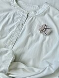 優しいベージュ色、あたたかくて優しいカフェオレみたいな色合いの鳥さんです。この色味はずっと見ていても優しい気持ちになり、着用の際にも合わせやすいカラーかなと思います。胸側から刺繍糸にてライン状にステッチをし、優雅に広がっていくデザインにしました。ステッチの種類もライン毎に異なります。全体の糸の色は一種類にしました。