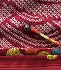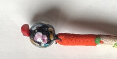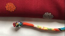 中綿を入れ、正絹の着物で作ったループを付け、ループの先にトンボ玉とと山サンゴを付けています。