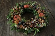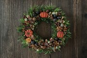 手作りのカボチャをアクセントにし、グリーンのティーツリー、月桃の実、アンバーナッツ、パクリなどで制作したハロウィンテイストのリースです。