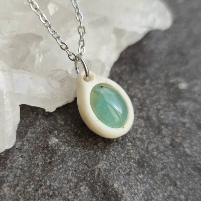白く滑らかな鹿角の質感と、深みのある青緑の石が対比を生み、自然素材ならではの存在感を放っています。