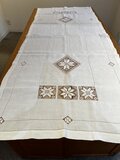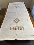 1900年代綿麻の大テーブルランナーです。中央や両端に雪の結晶を思わせる刺繍をしたパーツを嵌め込んだ透かし模様のような装飾がエレガントです。