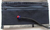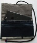 藍の筒掛けで、ファスナー付きの2重の外ポケットを付けています。