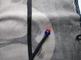 中綿を入れ、黒の着物で作ったループを付け、ループの先に、トンボ玉と山サンゴを付けています。