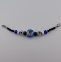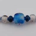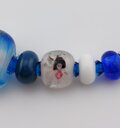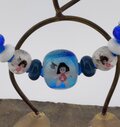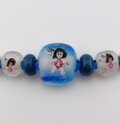 白地に青のガラスをかぶせた玉の中に鉞担いだ金太郎のパーツを入れました。両端の白いとんぼ玉の中にも金太郎がいます。キラキラしているのはプラチナ箔です。