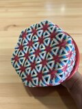 正六角形で、六角編みというデザイン性の高い技法を用いて仕上げています。