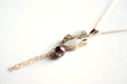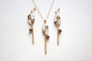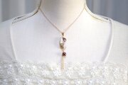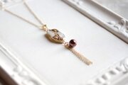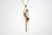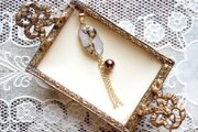 スライスアゲートのような光沢のある白いレジンにブラウンの模様を描き、ガラスパールとフリンジを添えたペンダント。