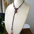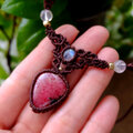 艶やかで鮮やかなローズピンクカラーが美しい良質なインド産ロードナイトと小粒ながらもブルーシラーがしっとりと輝くレインボームーンストーン(ホワイトラブラドライト)を合わせたマクラメ編みチョーカーネックレスです。