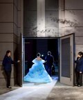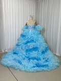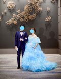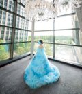 実例写真!カラードレス ブルー グラデーション パフスリーブ リボン 柔らかく重ねたチュールスカート 前撮り