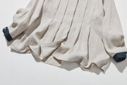 さらに、素材には上質なフレンチリネンを採用。麻独特の風通しの良さと、しなやかな肌触りが魅力です。そしてもう一つのポイントが、ボディと袖が生成り、襟とカフスがネイビーというコンビカラーデザイン。この配色が、清潔感と知的な印象をまとわせ、全体のシルエットを引き締めます。