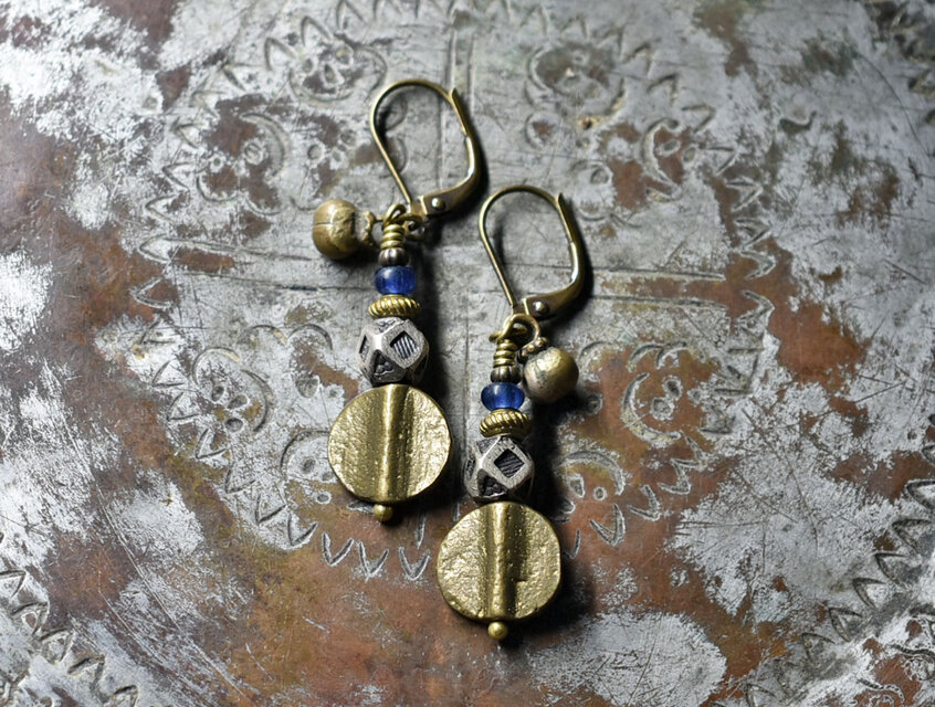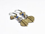 アフリカンブラスとトゥアレグビーズ、ブルービーズ、民族鈴のピアス