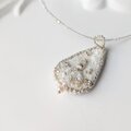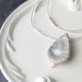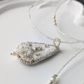 フランス製ヴィンテージビーズ(スフレガラス)、チェコ製シャーロットビーズ、淡水パール、ホワイトトパーズ、国産リネン、牛革、医療用サージカルステンレス