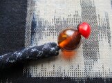 中綿を入れ、男絣で作ったループを付け、ループの先に蟻入りの琥珀の玉と山サンゴを付けています。
