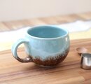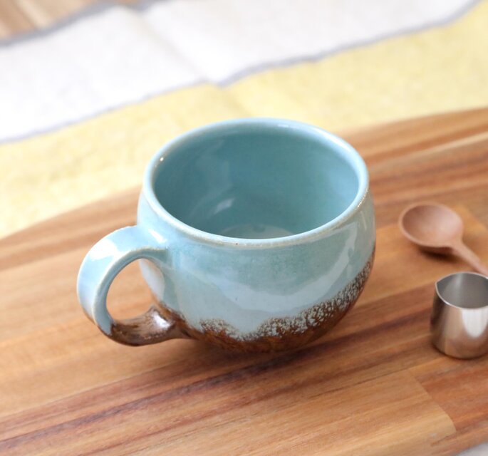 ふっくら丸い形が可愛らしいマグカップ。ブルーと焦茶のコントラストが器の雰囲気を引き締めます。