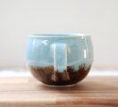 なんとも言えないくすみブルーを発色する釉薬と、マットな質感の焦茶の釉薬。