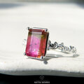 This ring features a captivating Bi-color Tourmaline, set in a band adorned with arabesque and filigree motifs.