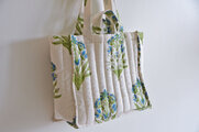 目にも鮮やかな美しい色彩、繊細ながら温もりと素朴さを感じさせるハンドブロックプリント。コットン100%素材のキルティングトートバッグはオールシーズン大活躍。