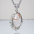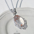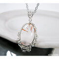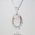 針状のリモナイトを内包するクォーツを、ボタニカルなイメージの透かし模様の台座にセットしたペンダント。