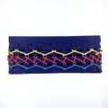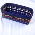 鮮やかなロイヤルブルーのクラフトバンド製小物入れです。アクセントにイエロー、レッド、スカイブルーの3色のクラフトバンドで装飾を施しています。