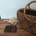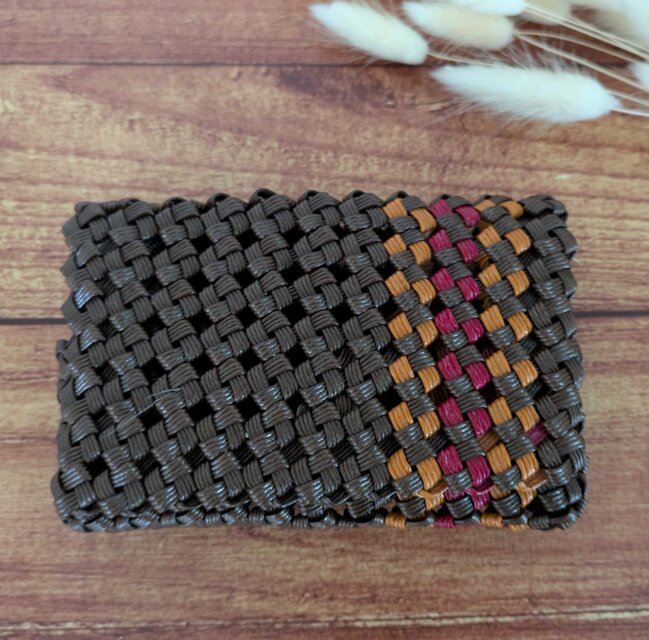 一つ一つ手作業で編み上げているため、同じものは二つとありません。しっかりとした作りで長くお使いいただけます。またこちらの作品は、表面がコーティングされたつやつやバンドを使用しており、従来のクラフトバンドよりも日焼けなどで色褪せしにくいのが特徴です。