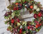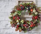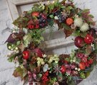 リース素材:アーティフィシャルフラワ-(造花):葡萄(赤紫)・小さな葡萄・りんご・アイボリーの実・赤い小さい実・スイトピー・小花・カラーリーフ・アンバーバーム・グリーン、など。
