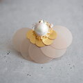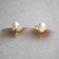 コットンパールとスワロフスキーというクリスタルガラスのクリア、ゴールデンシャドウを集めて、片側だけベージュグレーという色とゴールドのスパンコールを羽のように編み込みました。