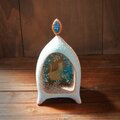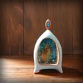 そんな癒しの小さな空間を作りたくて試行錯誤の末こんなかたちになりました。背面に明かりを呼び込む開口部を作りました。お天気によってはうまく光が差しこみガラスがきらめいて華やぐことでしょう。