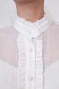★スタンドカラーに小さなフリルを添えて、さりげない可愛らしさをプラスしました。