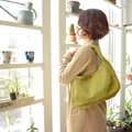 スナップボタンで閉じられる口と、側面の大きなポケットで機能的なうえに、カジュアル過ぎない上品なショルダーバッグ。バッグのマチから続くショルダー紐を持つと、ゆるい三角形に見える優しい印象のカバンです。