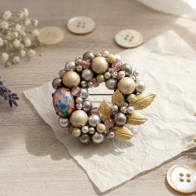 ヴィンテージのガラスカボションを中心に、アクリルパールやチェコガラスを贅沢にあしらい、立体的でリースのようなデザインに仕上げました。