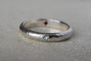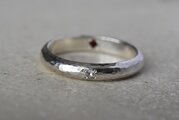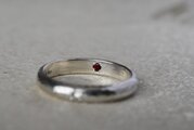 シルバーで制作を行った甲丸リングの外側にブルームーンストーンを留めて、内側にガーネットを留めて制作を行ったリングになります。