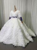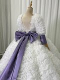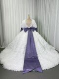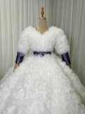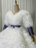 ウェディングドレス 長袖 Vネック リボン もこもこドレス ロングトレーン ボリュームドレス 拳式/前撮り
