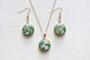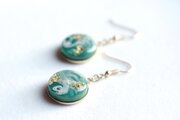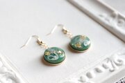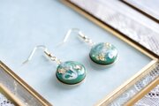 こっくりした緑色のレジンに金箔をあしらい、ホワイトを燻らせた幽玄な雰囲気のピアス。