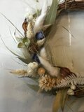 自然素材をふんだんに使用し、色とりどりの秋の花々や葉っぱをバランスよく配置しました。リースのふんわりとしたデザインは、温かみを感じさせ、お部屋の雰囲気を一層引き立ててくれます。