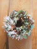 ドライフラワーなのですが、色彩に富んでいて、オレンジ色の木の実や、ブラウンのお花や松ぼっくりが、秋を感じさせてくれます。また、箱を開けた時の、ユーカリの葉のとても良い香りも、嬉しかったです。今回も、素敵なリース、ありがとうございました。