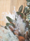 瀬戸内の森で育ったユーカリとウラジロガシを、風に吹かれたように立体的に紡ぎ、木の実とパンパスグラスをダイナミックに添え、秋の気配を感じていただけるようなナチュラルリースに。