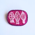 ベリーカラーのリネン地に小さな木の葉を丁寧に刺繍しました。