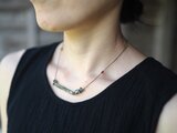 翡翠の管玉に樹木の化石に模様を施したプンテック、スプーンの様な形状のシルバービーズ、編み紐や留め具にも天然石やガラスのビーズを散りばめました。