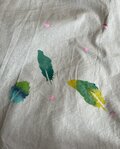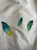 ペットのインコの羽根からインスピレーションを得て、緑や黄、青色を使いステンシルで描きました。