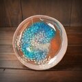 ガラスの溶け合った表面はつるりとしていて水を溜める事も出来ます。キラキラ光る細かな貫入の下にほんのり透け見える模様は不思議と奥行きを感じさせます。深く静かな世界をお楽しみ下さい。