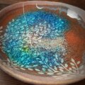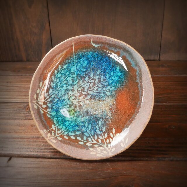 素焼き後、外側にはブルーの釉薬を吹き付け、中には数色のガラス粉を置き本焼成します。高温で溶けて流動するので、その色や厚みで模様がはっきりと見えにくい所がどうしても出てしまうのですが、かすかな記憶を辿るような独特のニュアンスとなりこの皿の個性として気に入っております。