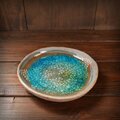 素焼き後、外側にはブルーの釉薬を吹き付け、中には数色のガラス粉を置き本焼成します。高温で溶けて流動するので、その色や厚みで模様がはっきりと見えにくい所がどうしても出てしまうのですが、かすかな記憶を辿るような独特のニュアンスとなりこの皿の個性として気に入っております。
